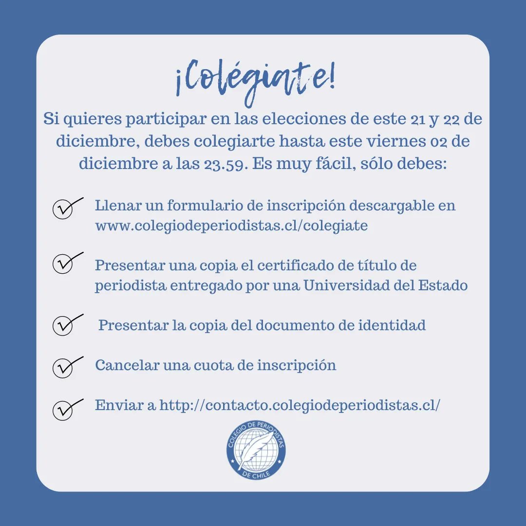 Toda la información sobre el proceso está indicada en el Reglamento Electoral, publicado en la página web del Colegio de Periodistas de Chile. https://www.colegiodeperiodistas.cl/