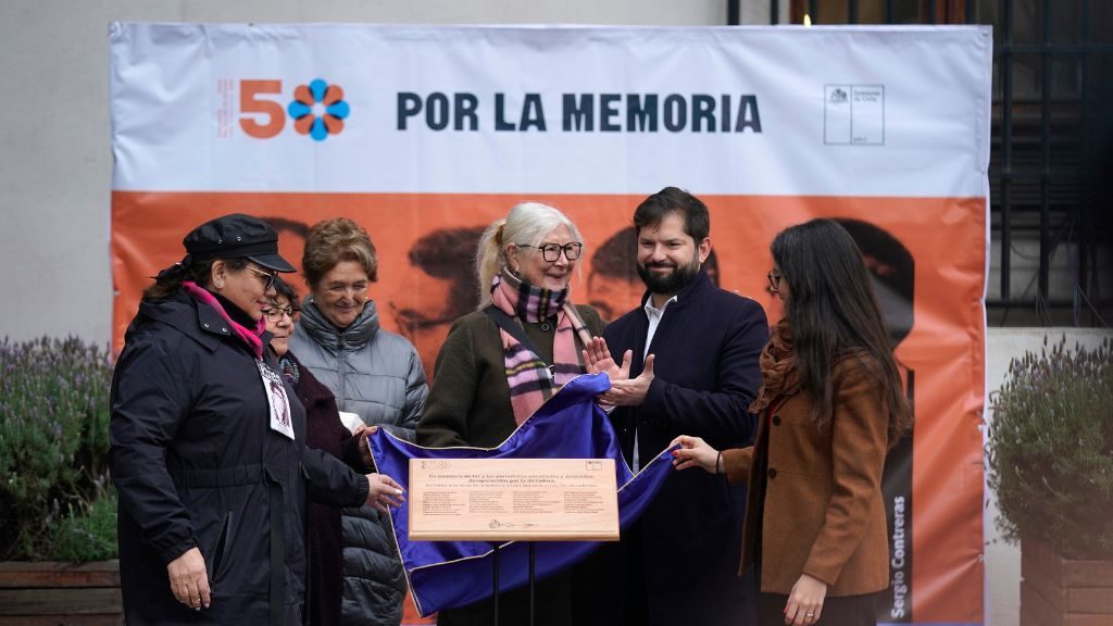 El presidente Gabriel Boric y la ministra vocera de La Moneda, Camila Vallejo, develaron una placa conmemorativa en memoria de los 37 periodistas ejecutados y desaparecidos tras el golpe de Estado en Chile del 11 de septiembre de 1973.
